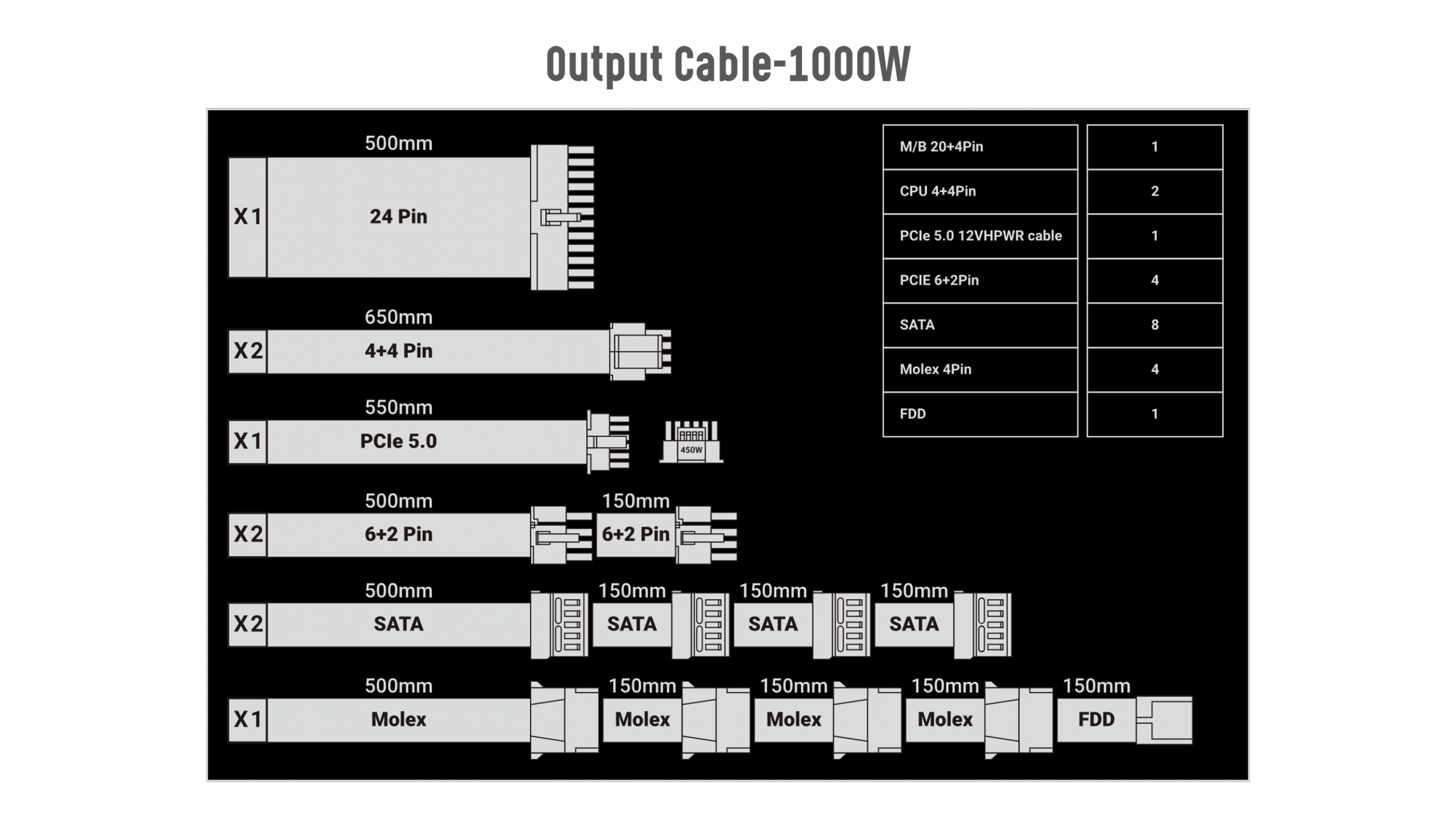 24Pin x 1 │ 4+4Pin CPU x 2 │ PCIe5.0 12VHPWR x 1 │ 6+2Pin VGA x 4 │ SATA x 8 │ Molex x 4 │ FDD x 1 |
